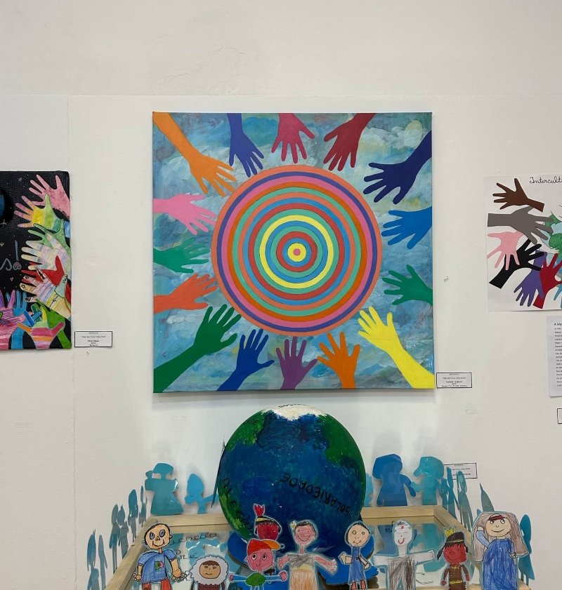 As turmas dos 7.ºA e 8.ºA desenvolveram um projeto em articulação vertical na disciplina de Educação Visual destinado à Exposição Arte Escola, no Museu Municipal de Vouzela, no âmbito da Feira do Livro "Folhas Soltas". Este ano o tema escolhido foi a Multiculturalidade, desta forma, quisemos mostrar como todos podemos fazer a diferença, e trabalharmos em conjunto para realizarmos algo com valor. O título da obra é “oito mãos + oito mãos”, uma pintura em acrílico sobre tela, em que as mãos simbolizam tanto o instrumento de trabalho/ de realização, como de união/ confraternização entre as pessoas. As cores podem invocar a harmonia na diferença e a alegria da partilha. E para ti? O que transmite esta obra?